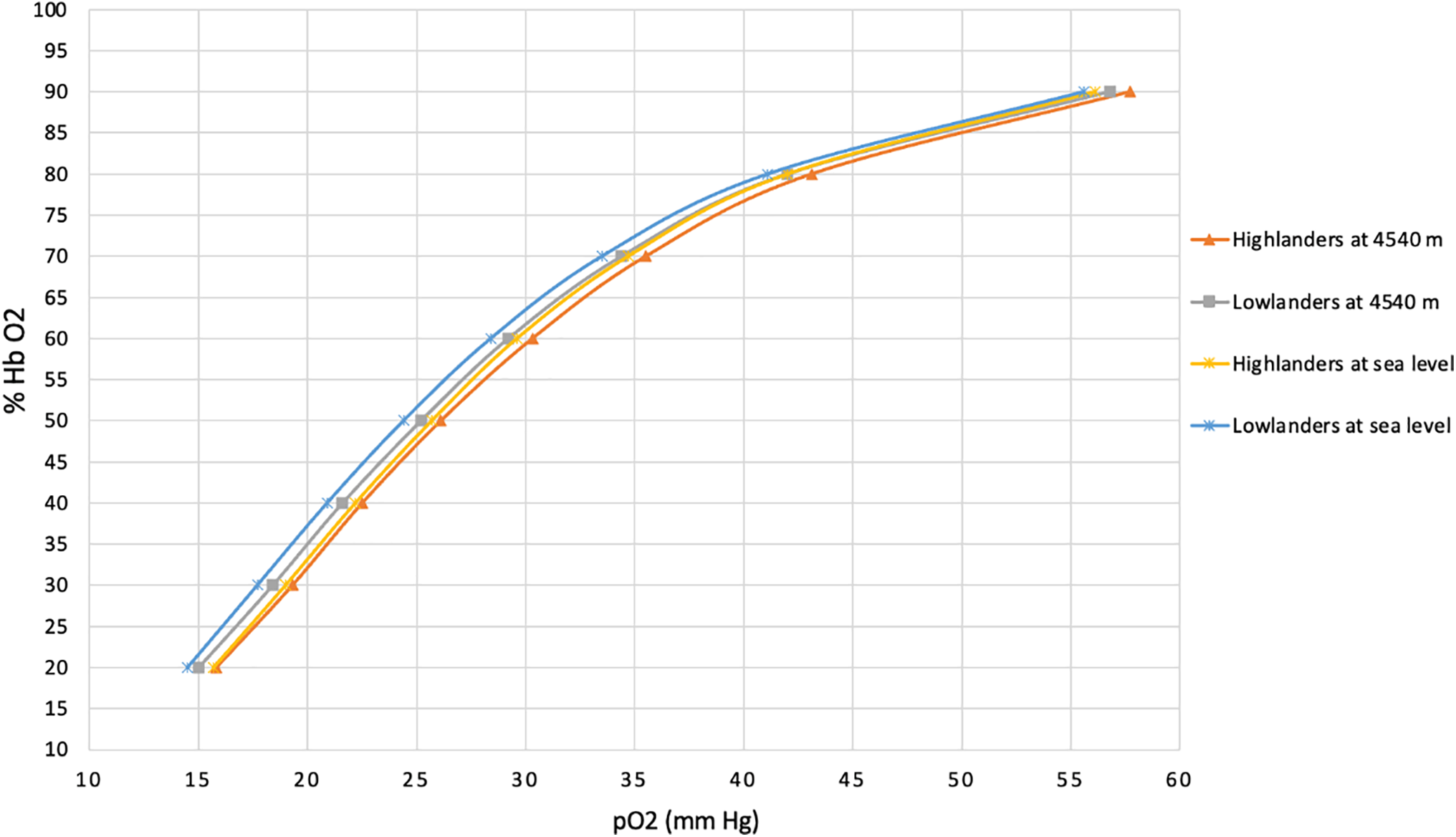 In 1944, Peruvian professors Aste and Hurtado discovered the main respiratory adaptations in high-altitude environments. In contrast to reports by Barcroftet al. (1923), they observed that for a 50% oxygen Hb saturation (HbO2) at a standardized pH = 7.40, the high-altitude dweller residents from Morococha (4,540 m altitude; PB = 453 mmHg) needed a PO2 = 26.13 ± 0.34 mmHg compared to the 24.39 ± 0.13 mmHg (ES = 0.95) needed by Lima residents (sea level) (Aste-Salazar & Hurtado, 1944), which is considered as a slightly shifted curve to the right among highlanders. Moreover, they reported a lower affinity for HbO2 at high altitudes. Fig. 1 shows the data from this study regarding the percentage of HbO2 from residents at sea level and upon their arrival at 4,540 m altitude, as well as from highlanders in both scenarios.