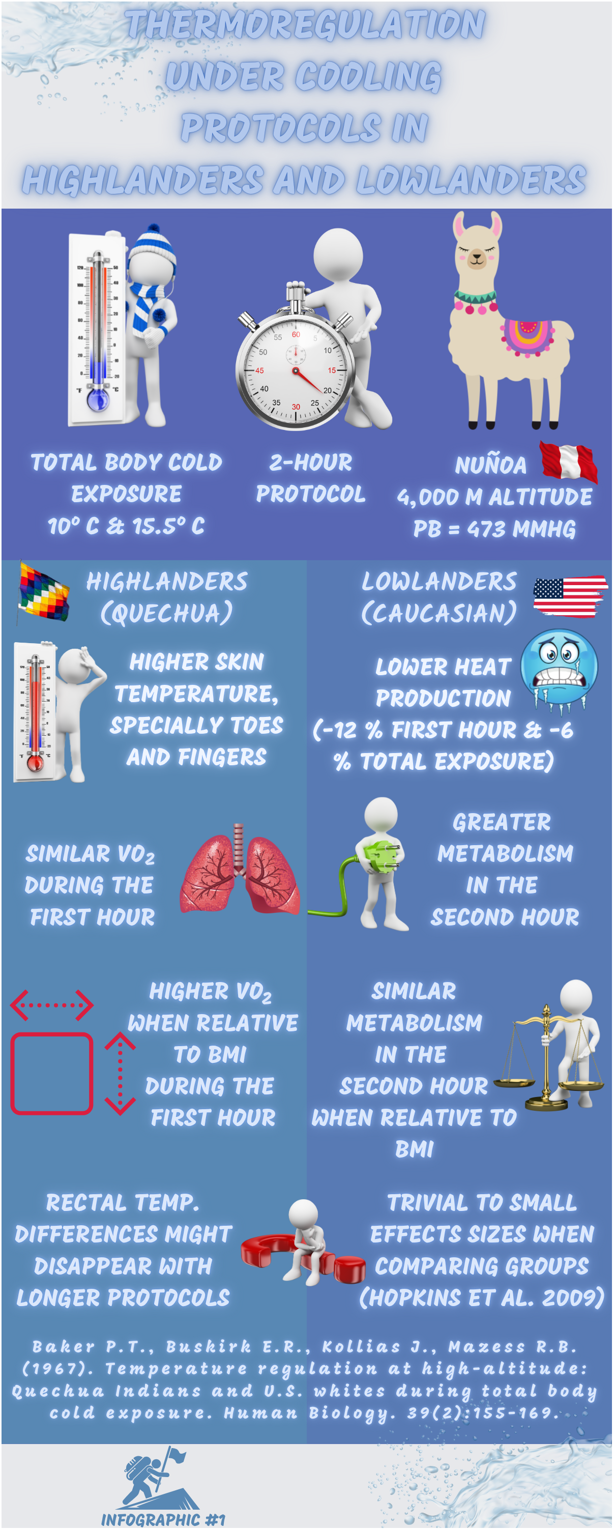 In May 1967, the first paper unveiled data regarding the thermoregulation response of 26-high-altitude native residents of Nuñoa and a group of 15-lowlanders from the USA who underwent two cold exposures lasting two hours each at 10.2°C and one cold exposure at 15.5°C in a room (refrigeration unit used to cool down the room) (Bakeret al., 1967). The main findings were: i) the high-altitude dwellers showed higher mean weighted skin temperatures compared to Caucasians before cooling (33.4°C ± 1.0°C vs. 32.3°C ± 0.6°C, ES = 0.55) and during both cold exposures (28.5°C ± 0.8°C vs. 27.7°C ± 0.7°C, ES = 0.47 at 28 min; 27.3°C ± 0.8°C vs. 26.6°C ± 0.8°C, ES = 0.40 at 60 min; 26.6°C ± 0.7°C vs. 26.0°C ± 0.8°C, ES = 0.37 at 116 min), ii) especially higher digital (toe and finger) skin temperatures were observed among the Nuñoa inhabitants compared to lowlanders before entering the cold chamber (e.g., toe temperatures in both groups were 27.0°C ± 3.7°C vs. 21.9°C ± 2.3°C, ES = 0.64) and throughout the cooling protocol (e.g., finger temperatures in both groups at 116 min were 14.6°C ± 2.4°C vs. 12.7°C ± 1.1°C, ES = 0.45), iii) Rectal temperatures (TR) were also higher in the high-altitude dwellers; however, the authors stated that this difference between groups might disappear with repeated exposures or > 2 hour cooling protocols (e.g., by the end of the 10.2°C exposure no differences were observed between groups 36.7°C ± 0.5°C vs. 36.5°C ± 0.4°C, ES = 0.22), iv) VO2 was about the same in both groups during the first hour of exposure (e.g., 0.30 L · min−1 ± 0.04 L · min−1 vs. 0.33 L · min−1 ± 0.07 L · min−1, ES = −0.02 at 28 min; 0.33 L · min−1 ± 0.06 L · min−1 vs. 0.37 L · min−1 ± 0.09 L · min−1, ES = −0.03 at 60 min), but in the second hour the metabolic activity was higher among lowlanders (e.g., 0.37 L · min−1 ± 0.06 L · min−1 vs. 0.44 L · min−1 ± 0.08 L · min−1, ES = −0.05 at 116 min), and v) VO2 relative to body surface area was strikingly greater in the lowlanders during the first hour (e.g., 0.20 L · min−1 · m−2 ± 0.03 L · min−1 · m−2 vs. 0.18 L · min−1 · m−2 ± 0.040 L · min−1 · m−2 · min−1, ES = 0.02 at 28 min; 0.21 L · min−1 · m−2 ± 0.04 L · min−1 · m−2 vs. 0.20 L · min−1 · m−2 ± 0.05 L · min−1 · m−2 · min−1, ES = 0.01 at 60 min) while there were no differences between groups in the second hour (e.g., 0.24 L · min−1 · m−2 ± 0.03 L · min−1 · m−2 vs. 0.24 L · min−1 · m−2 ± 0.04 L · min−1 · m−2 · m−2 · min−1, ES = 0.01 at 116 min). In conclusion, the highlanders reported a 6% higher heat production expressed as kcal · m−2, a 6% higher heat loss not replaced by metabolic activity, particularly from digital areas, compared to lowlanders, and an 8% greater total heat exchange, considered as the sum of the heat loss and heat production. However, as well as the level of significance found by the authors, but not reported when differences existed, once the magnitude of change of the different variables was estimated and expressed as the effect size (ES), such effects were interpreted as trivial or small (Hopkinset al., 2009) in most comparisons between groups. See below in Fig. 3 the infographic of this study.