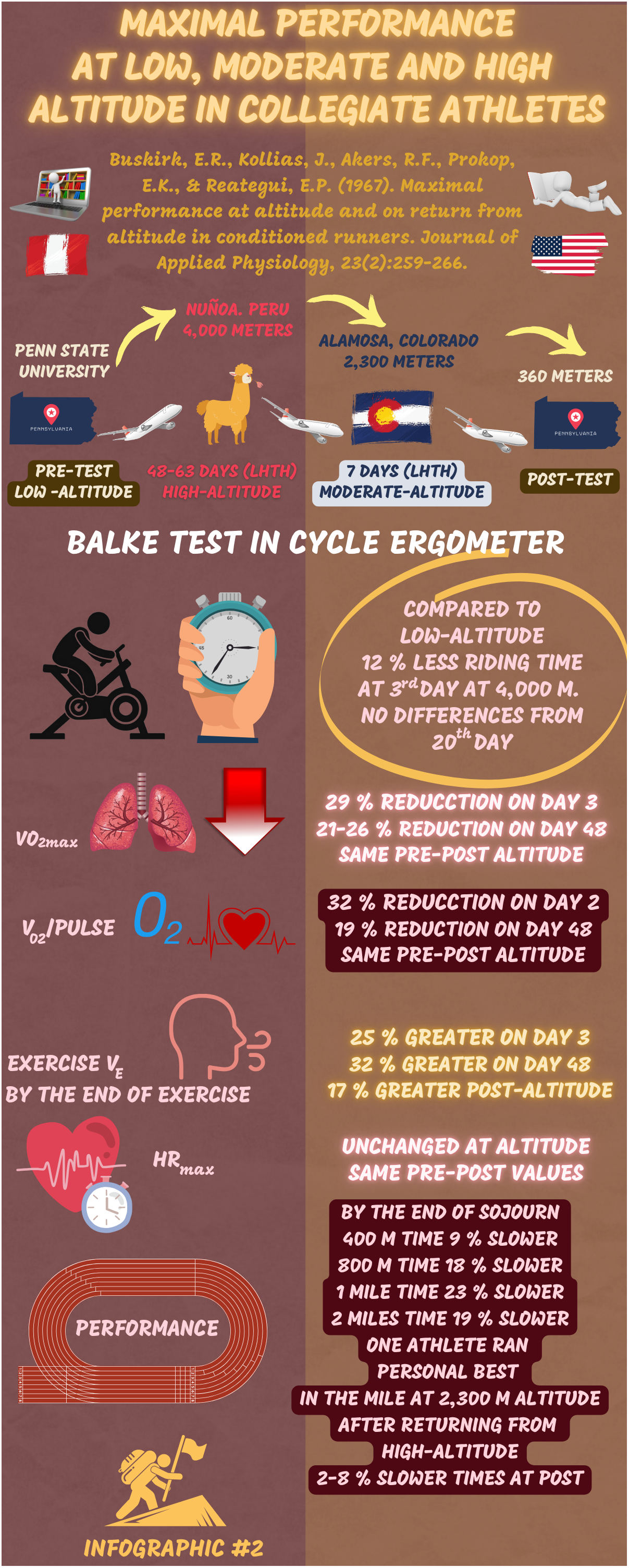In the late 60’s and the early 70’s, four studies addressed both the physiological response and athletic performance of low-altitude dwellers residing and training at ~3,100 m (Dill & Adams, 1971; Groveret al., 1966, 1967; Reeveset al., 1967). Interestingly, the “Lexington” studies (Groveret al., 1966, 1967; Reeveset al., 1967) were published in 1966 and 1967, the year before and the same year as the series of exercise physiology studies carried out in Nuñoa and led by Dr. Buskirk (Buskirket al., 1967; Kolliaset al., 1968). However, the experimental protocol of the latter was conducted in 1965 and was part of the Human Adaptability Program of the International Biological Program founded by the U.S. Army Medical Research and Development Command (USAMRDC) and the American National Institute of General Medical Sciences (Frisancho, 2025; Littleet al., 2025).