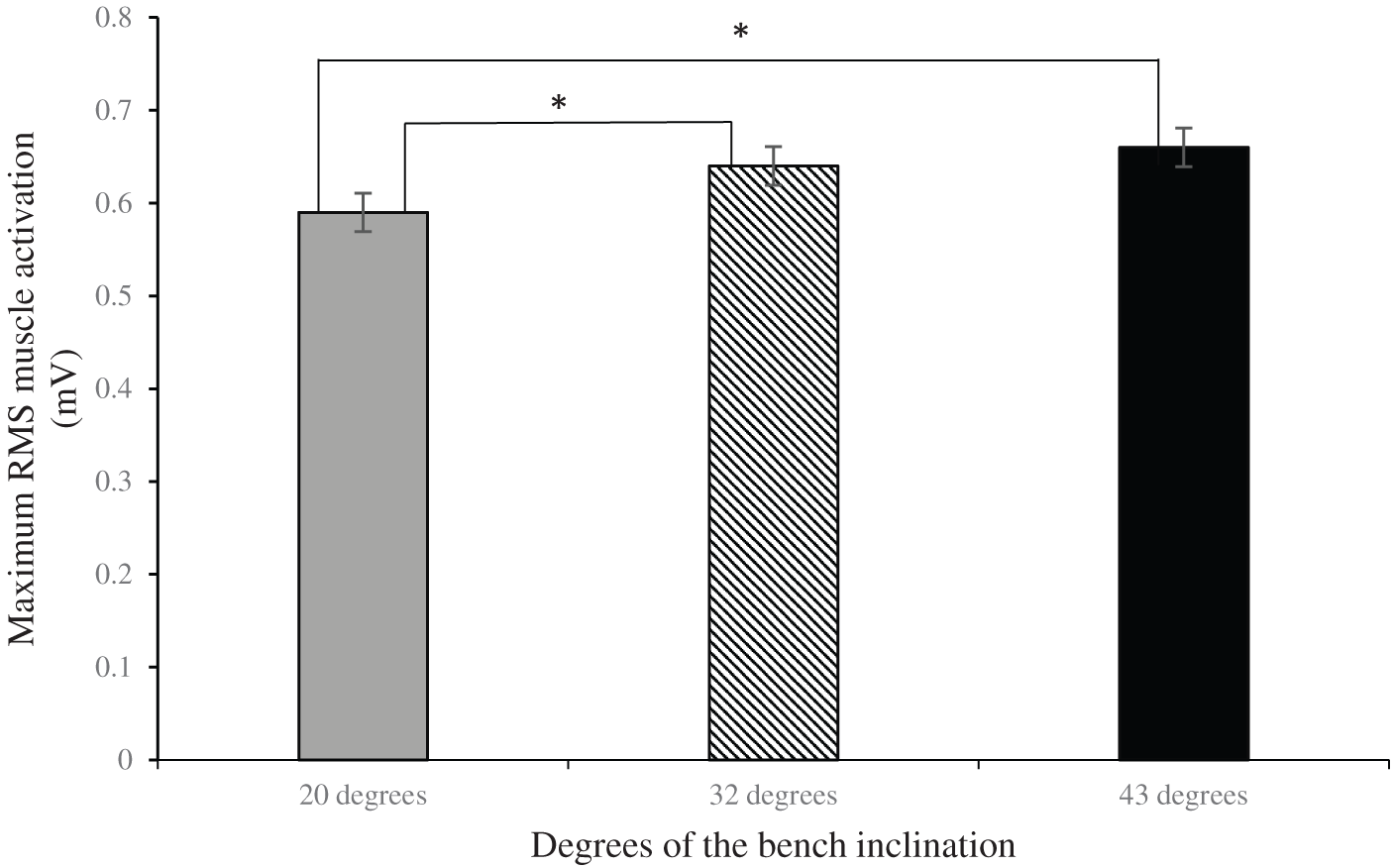 The conducted repeated measures ANOVA indicated that the mean of the maximum RMS muscle activation of the clavicular head of PM muscle while performing the barbell inclined bench press on a bench inclined at 20° (0.59 ± 0.29 mV) was significantly [F(2,18) = 5.55, p = 0.013, η2 = 0.381] lower compared to the angles of 32° (0.64 ± 0.32 mV, p = 0.033) and 43° (0.66 ± 0.33 mV, p = 0.009) (Fig. 2). Meanwhile, performing the inclined barbell bench press at 43°resulted in higher activation of the clavicular head of the PM muscle during concentric contraction compared to 32°; however, a statistically significant difference was not found (p > 0.05).