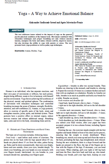 The text addresses issues related to the impact of yoga on the general psycho-physical condition of the human body. Movement combined with relaxation techniques and proper breathing not only reduces muscle tension, energizes the body and mind, releases activity, improves mood, but also develops the ability to cope with anxiety or stress. The text presents basic yoga positions as well as palm yoga techniques.
