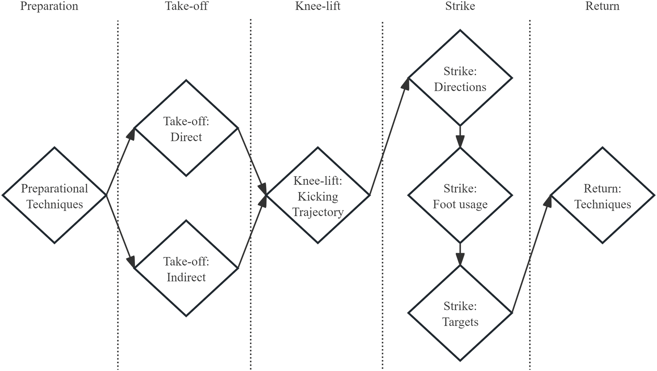 This analytical process resulted in a systematic categorization and conceptualization of the stage-specific technical factors, indicators, and execution structure of KT-MTC. The findings informed the development of additional interview questions targeting: (i) the technical factors and execution structure of KT-MTC, (ii) the technical indicators of the preparation stage, (iii) the take-off stage, (iv) the knee-lift stage, (v) the strike stage, and (vi) the return stage.