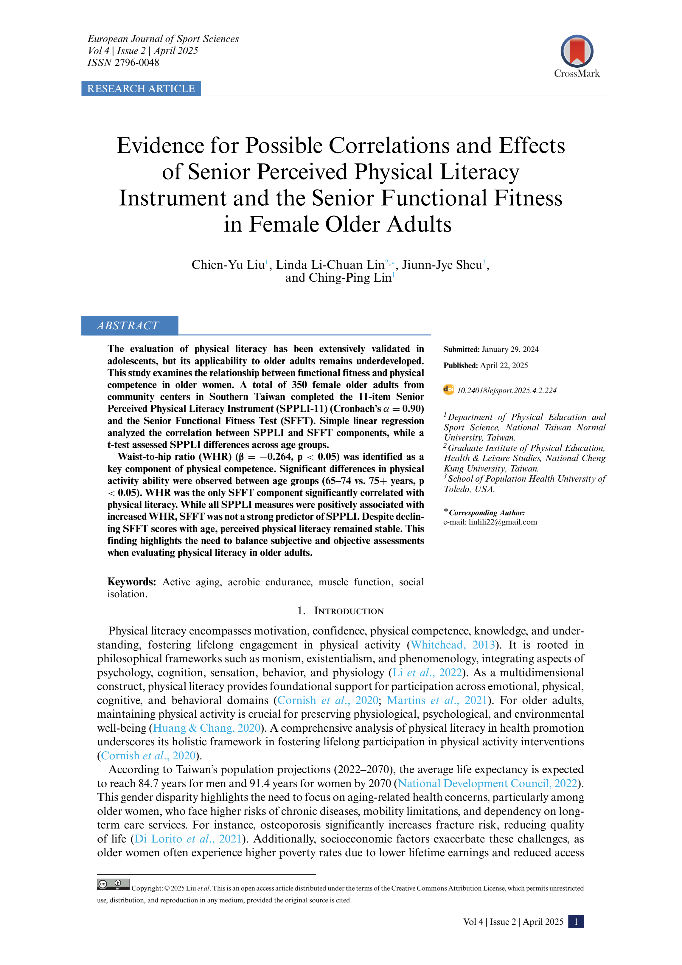 Evidence for Possible Correlations and Effects of Senior Perceived Physical Literacy Instrument and the Senior Functional Fitness in Female Older Adults